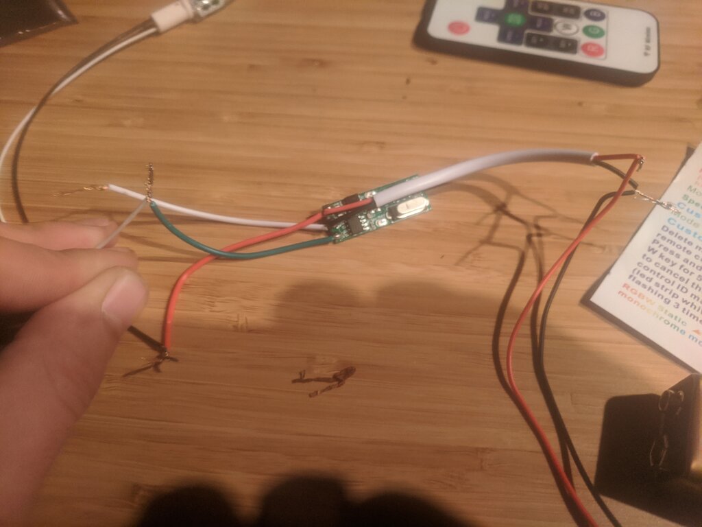 Light is at high intensity. Whatever i press id dosen't do a thing. If i connect GREEN(Receiver) to RED or WHITE remains at the same intensiry and no response from buttons.